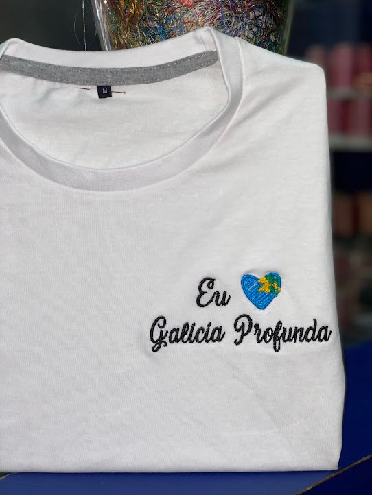 Camiseta básica con bordado de «Eu love Galicia Profunda». de 160gr, 100% algodón ring spum, cuello elástico en canalé de 1×1.